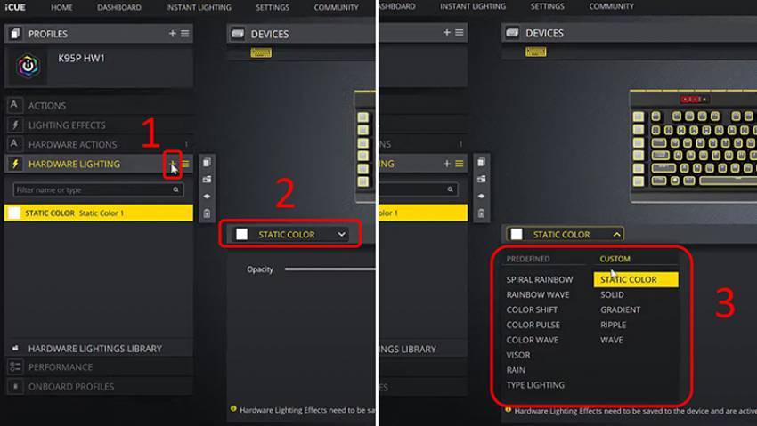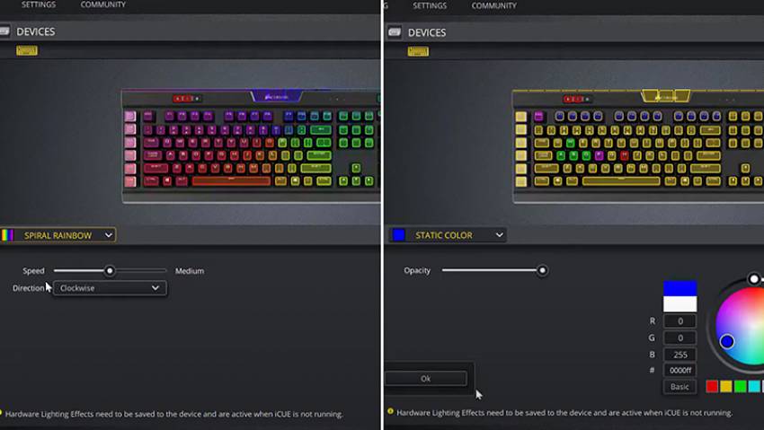 Dưới đây là ví dụ về cách đổi màu với bàn phím cơ Gaming Corsair K68 RGB Mechanical với phần mềm Corsair iCUE.
