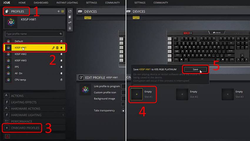 Bước 5: Cuối cùng bạn cần phải lưu hiệu ứng đèn bàn phím này bằng cách nhấn vào Profiles và chọn tên profile mới chỉnh, sau đó ấn tiếp Onboard Profiles > Empty > Save.