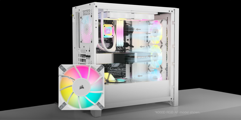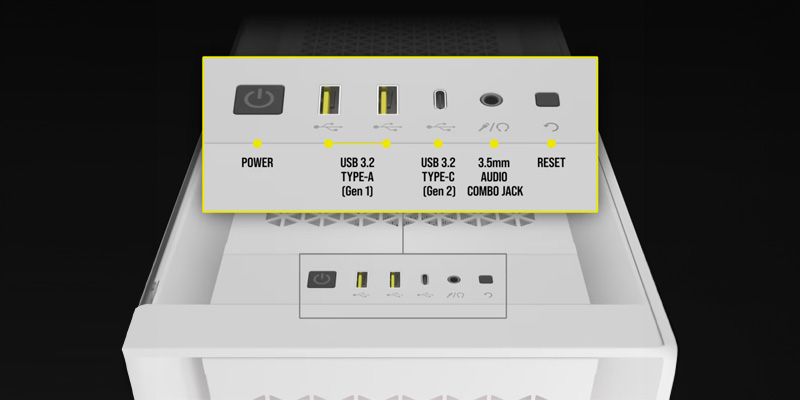 Mặt trước của Case máy tính Corsair iCUE 5000D RGB Airflow True White được tối ưu hóa cung cấp luồng không khí lớn đến hệ thống của bạn để làm mát tối đa. các chi tiết trong máy.